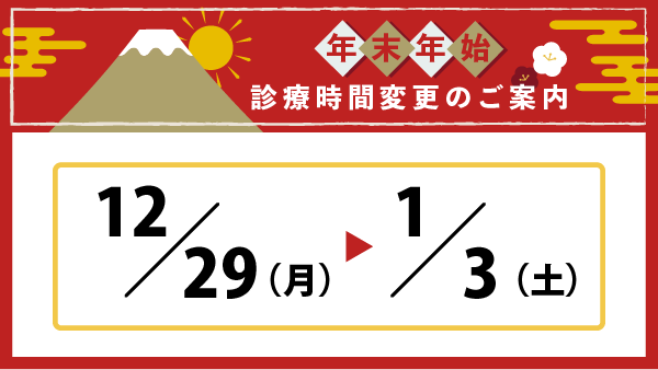 ※12/29~1/3の期間中、診療時間が9:00~11:00 / 16:00~18:00に変更となります。