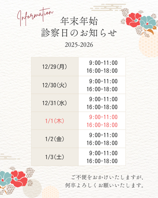 12/5๏ผ้๏ผใๅๅพๅฎๅ จไบ็ดๅถใใใใใใใใใใใใใใใใใใใใใใใใใใใใใใใใใใใใใใใใใใใใใใใใใใใใใใใใ12/29๏ผๆ๏ผใป30๏ผ็ซ๏ผใป31๏ผๆฐด๏ผใ็ญ็ธฎ่จบๅฏใ9๏ผ00-11๏ผ00-/16๏ผ00-18๏ผ00